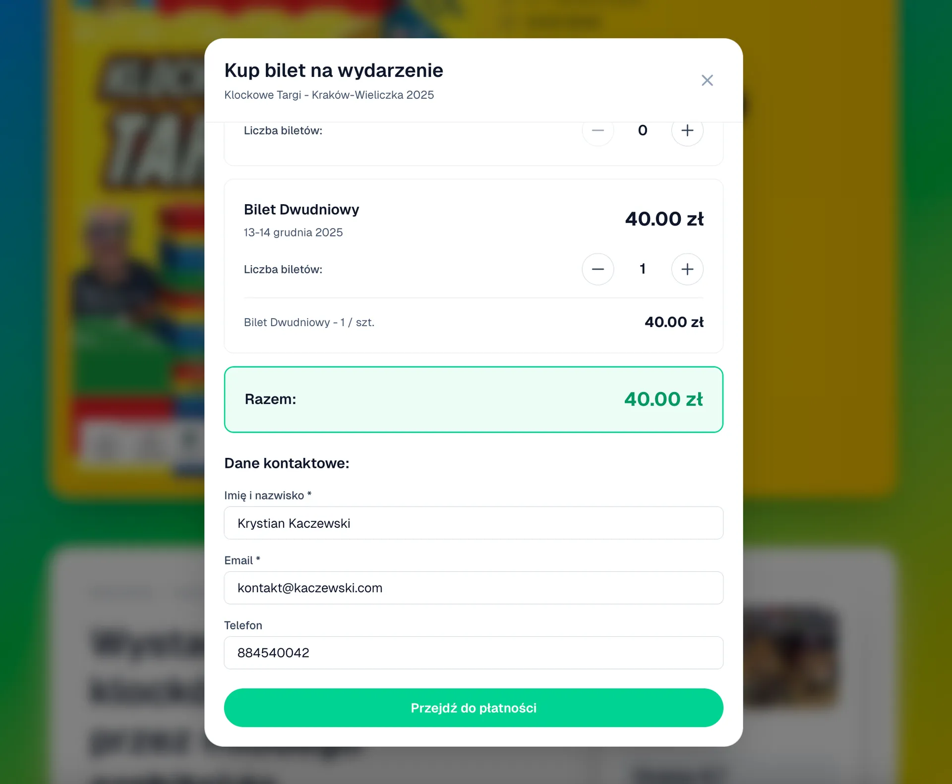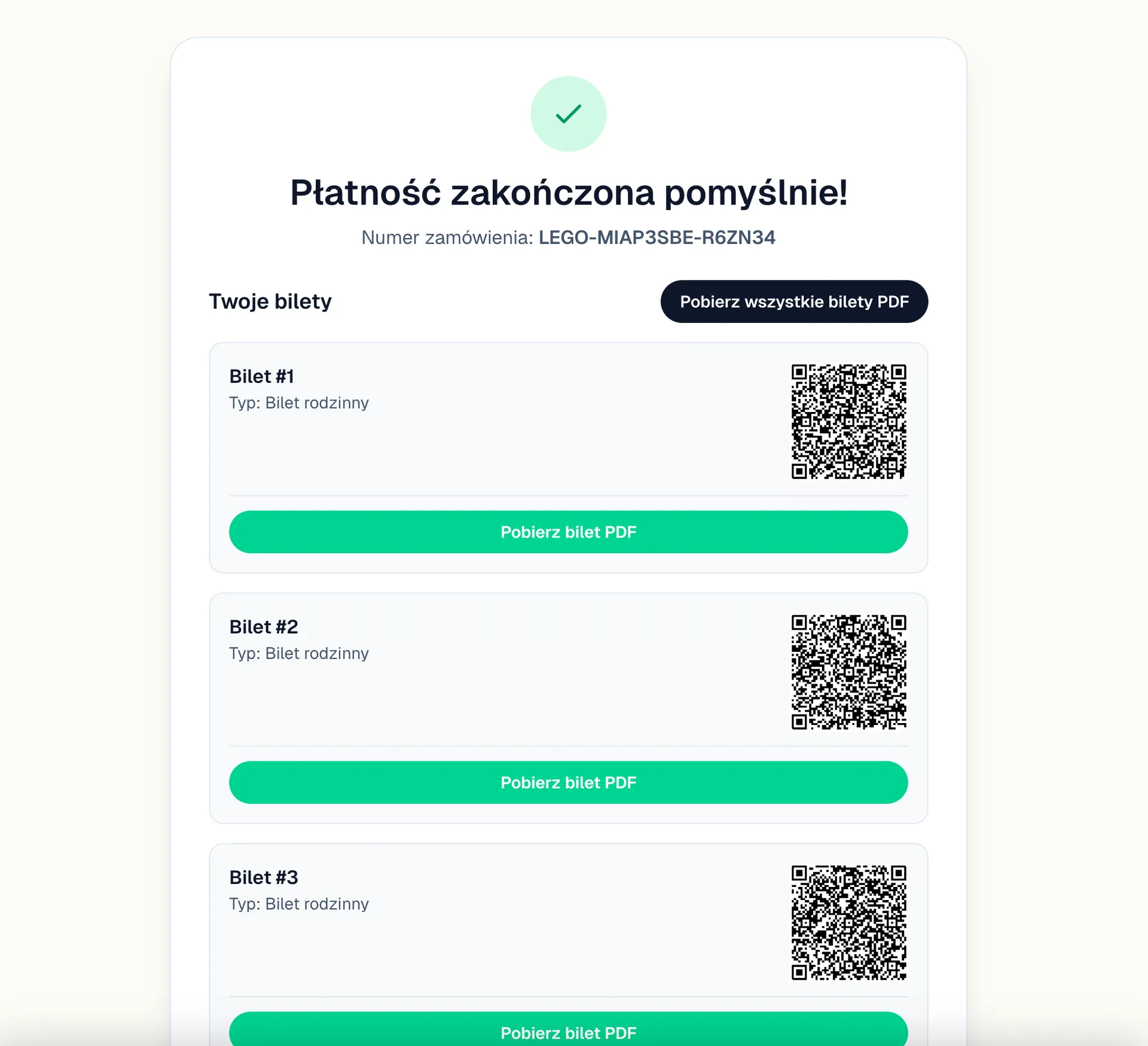 Najważniejszą częścią systemu jest kompleksowy moduł zakupu biletów online z pełną integracją płatności Cashbill. System automatycznie generuje unikalne bilety z kodami QR, które są weryfikowane w czasie rzeczywistym przez panel administracyjny. Każdy bilet jest generowany jako dokument PDF, gotowy do wydruku lub pobrania na urządzenie mobilne.