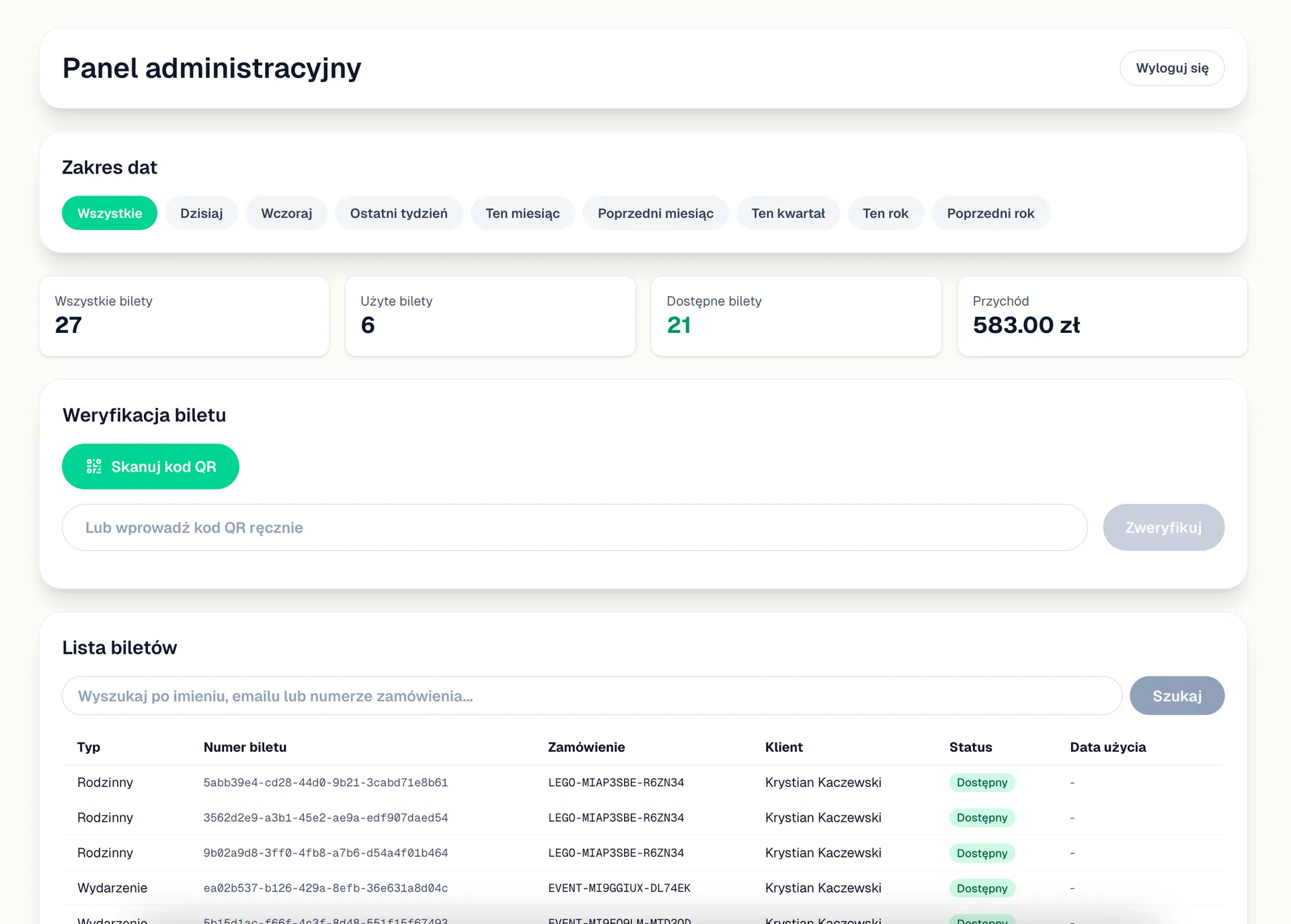 Właściciel otrzymuje rozbudowany panel administracyjny, w którym może weryfikować bilety poprzez skanowanie kodów QR (zarówno przez kamerę, jak i ręczne wprowadzanie), przeglądać wszystkie bilety z zaawansowanym wyszukiwaniem i filtrowaniem, analizować statystyki sprzedaży w różnych zakresach czasowych oraz monitorować przychody i wykorzystanie biletów. Panel oferuje intuicyjny interfejs z responsywnym designem, dostosowany zarówno do urządzeń mobilnych, jak i desktopowych.